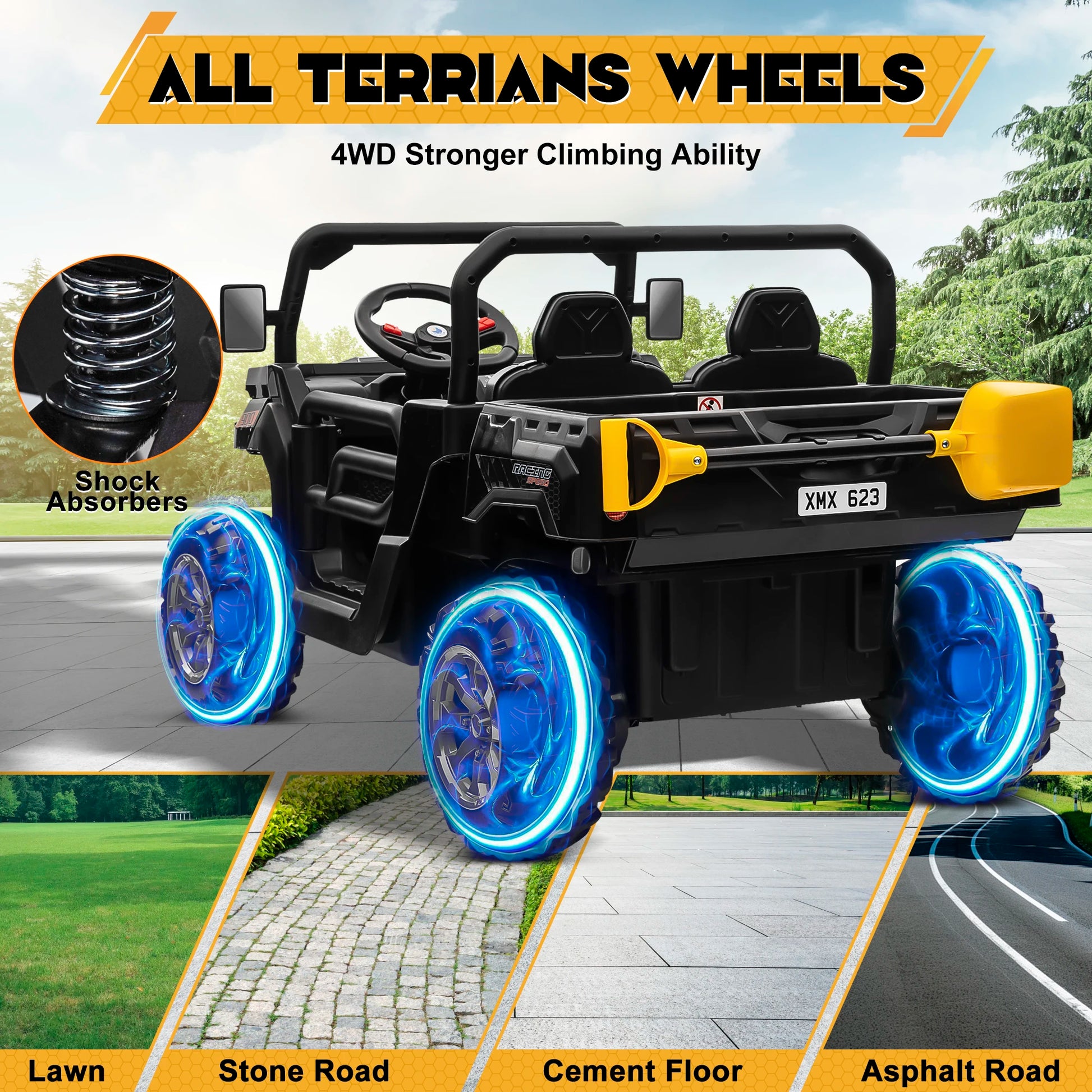 - Powerful 24V system gives you steady traction with four 200W motors, 4 anti-slip tires, and independent shocks across grass, gravel, and pavement.